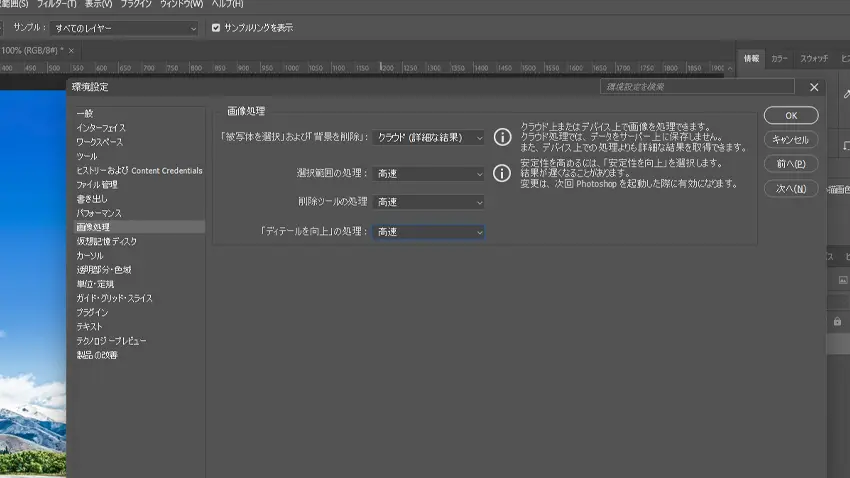 この機能はクラウド処理のみで利用できます。「編集」>「環境設定」>「画像処理」に進み、「被写体を選択」および「背景を削除」を「クラウド(詳細な結果)」にしておきましょう。