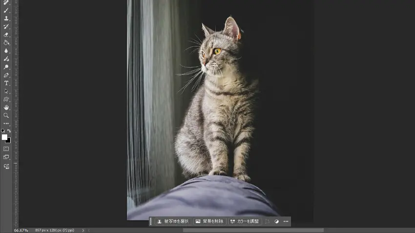 いつから表示されるようになったのか覚えいていないのですが、カンバスの上に画像を乗せると現れるコンテキストタスクバーですが、被写体を選択、背景を削除、カラーを調整といったメニューが選択できるようになってます。