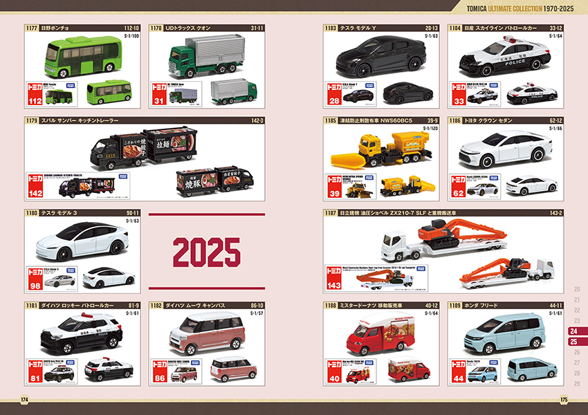 1970年に初めて発売された6台から2025年7月までのトミカを掲載。いわゆる単体トミカ(1~150番)だけではなく、「ロングタイプトミカ」(車両の長いトミカ)も追加しています。掲載車両は1200台超えしています!