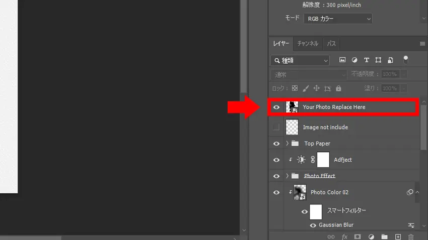 レイヤーの「Your Photo Replace Here」と書かれたサムネ部分をダブルクリックしましょう。