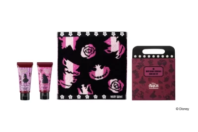 マッドハッターの奇妙なお茶会をイメージした、甘みのある上品な紅茶の香りのハンドクリームと、薔薇を基調としたみずみずしいワンダーフローラルミックスの香りがするハンドクリームの2種類に加え、作中に登場する様々なキャラクターがデザインされたミニタオルがセットになっています。