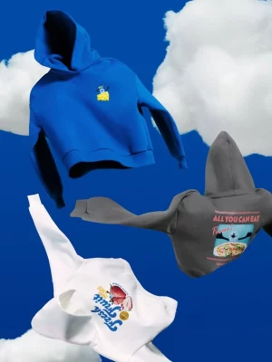 まずキッズのアイテムでは、ポップなプリントがポイントの「ヘビーウェイトスウェットパーカー」が白・ブルー・グレーの3種類登場!いちご、チーズ、ピザからスンスンが顔を覗かせる、それぞれ異なるデザインとなっています。