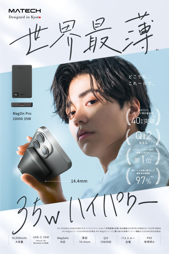 京都発のクリエイティブブランド MATECHが、最新規格Qi2と最大35W出力に対応した超薄型ハイパワーモバイルバッテリー「MagOn Pro 10000 35W Qi2」 をAmazon.co.jpにて新発売した。