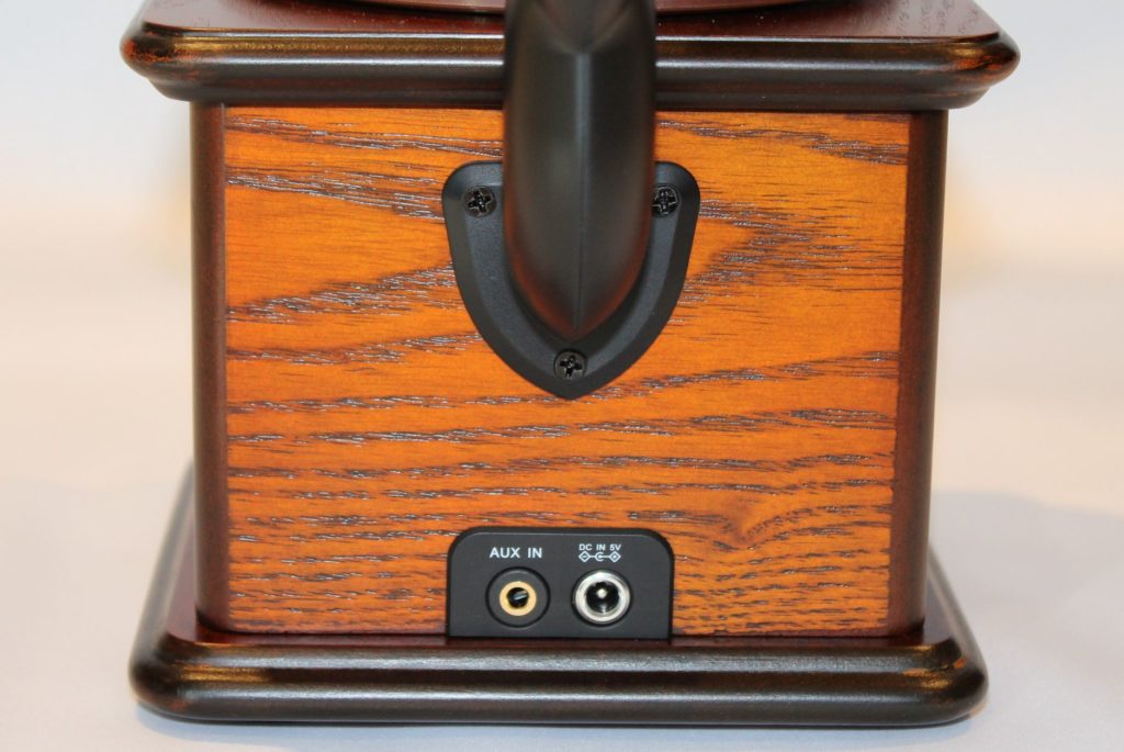 さらに外部入力機能として3.5mmミニピンプラグの入力端子を搭載!お手持ちの再生機器と接続して、ラッパから奏でる様々な音楽をレトロサウンドで楽しむこともできる。