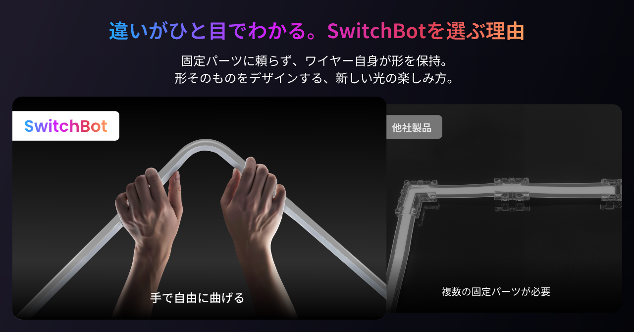 手で曲げて形をつくれる柔軟素材と、RGBICによる複数色同時発光で、1600万色の光を思いのままにデザインできる。AppleやAlexaからの音声操作にも対応し、もっと自由に空間演出。