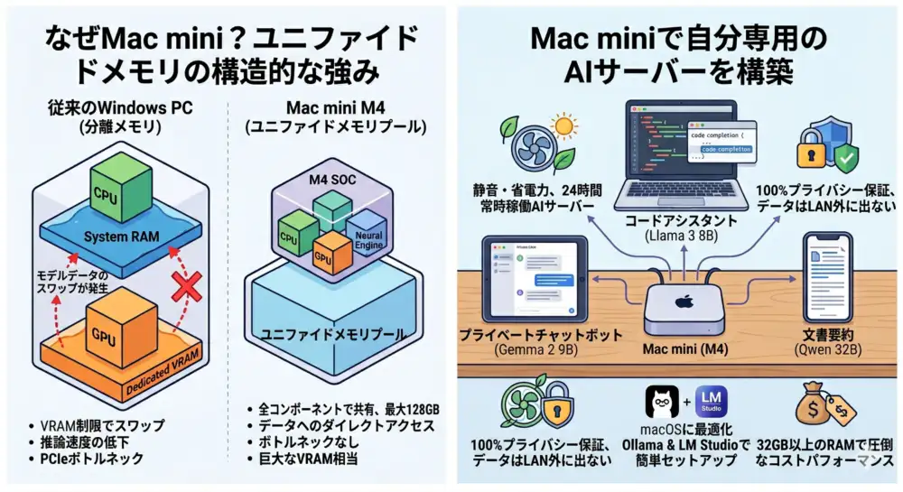 Mac miniがローカルLLMで支持される最大の理由は、ユニファイドメモリアーキテクチャ(UMA) にあります。