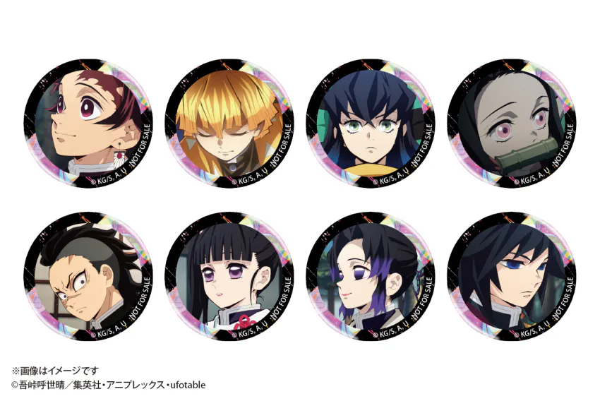 缶バッジにはアニメ「鬼滅の刃」に登場するキャラクター8人のイラストをそれぞれプリントされ、全8種からランダムに。