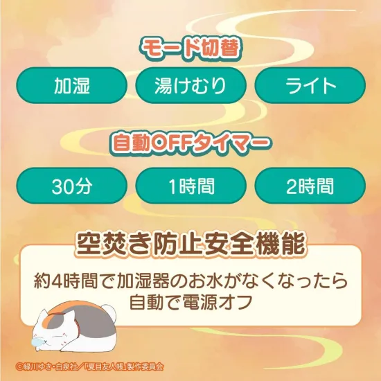 デスクなどに置きやすいコンパクトサイズで、パソコン作業中や就寝時の乾燥が気になるとき、近くに置くことでリラックスするニャンコ先生の姿に癒されながら、快適な湿度を保つことができる。としています。