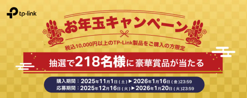 TP-Link(ティーピーリンク)が、2025年12月16日(火)より豪華賞品が当たる「お年玉キャンペーン」をスタートしました。 期間中に対象製品を購入して応募すると、抽選でiPad AirやAmazonギフト券、最新のスマートホーム製品などが総勢218名に当たります。年末年始に自宅のネット環境を見直そうと考えている方には絶好のチャンスです!