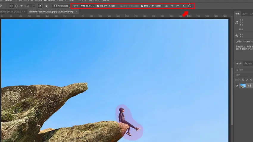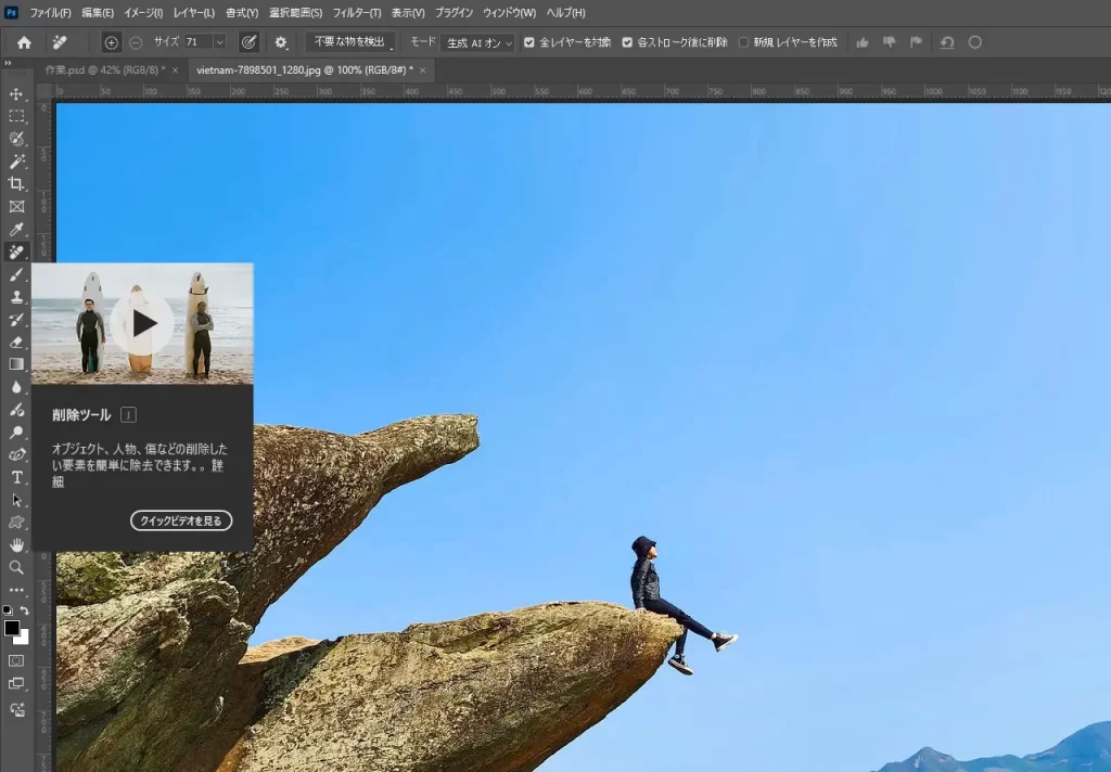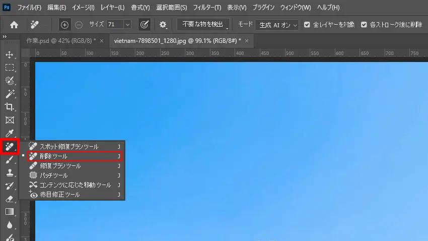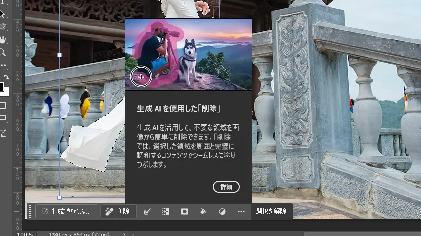 AIの搭載で画像の加工がますます楽になっていますが、自分が一番お世話になるのが削除ツールです。とりあえず、撮っておいていらないものは後から削除ということが多くなったような気がします。以前は大変だった削除した後の背景の補完作業もAIが自動で補ってくれるようになりました。ありがたいことです。