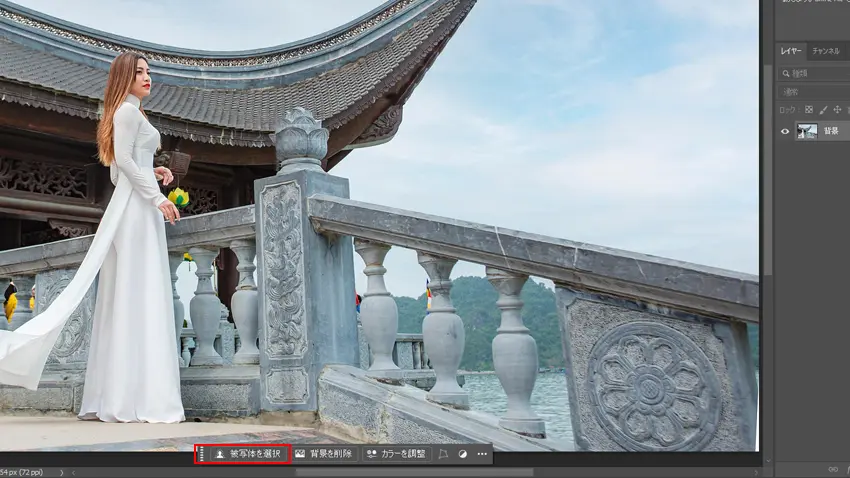 画像の下に被写体を選択というコンテクストメニューがありますのでクリックして選択範囲を作り、その後に現れる削除ツールのボタンを押してみましょう。