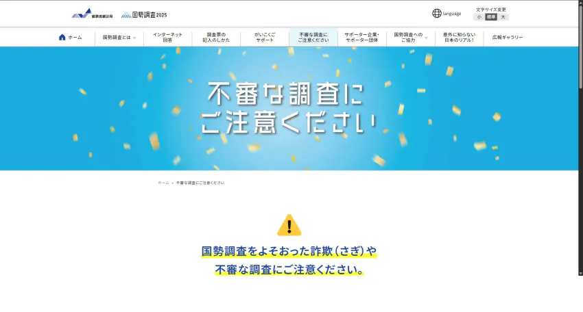 - 不審な訪問や電話などがあったときは、お住まいの市区町村の国勢調査担当や自治体の消費生活センター、警察にご相談ください。