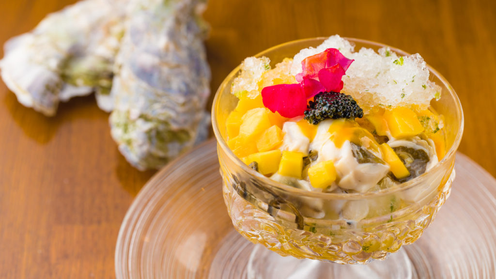 こうやって見てみると、爽やかなかき氷かと思いきや、しっかりと生牡蠣がありなかなかのビジュアルですね。バジル氷と生牡蠣は相性がいい気がしますが、フレッシュマンゴーの自家製ソースと合うのかが気になります。