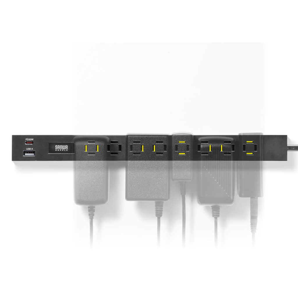 一般的な電源タップでは、大型のACアダプタを1つ挿すだけで、隣の差込口が隠れて使えなくなることが珍しくありません。