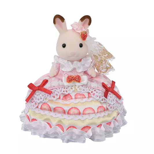 ショコラウサギの女の子は、ストロベリーケーキをモチーフにした豪華なドレスを着ています。