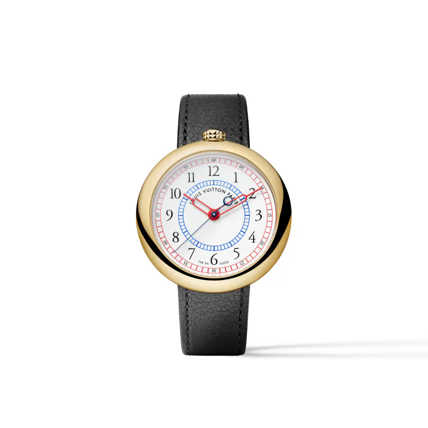 39mmのイエローゴールド製ペブルシェイプケースに、光沢感のあるグラン·フー エナメルのダイヤルを組み合わせたこのウォッチは、オリジナルのクォーツキャリバーに代わる自社製自動巻きムーブメントを搭載。ミニマリストなタイムオンリーウォッチには、ヘリテージピースのデザインを象徴するグラフィックな要素が息づいており、新しいツインアワーとミニッツスケールに施されたレッドとブルーのアクセントがその魅力を際立たせています。メゾン初の腕時計がデビューした1988年へのオマージュとして、「ルイ·ヴィトン モントレ」は188点のみの限定生産です。