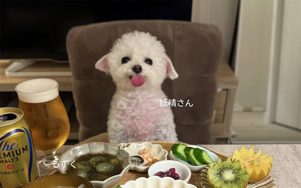 晩ご飯と一緒に愛犬である白いトイプードル「妖精さん」を撮影した写真を、毎日のようにポストし続けているアカウントなのですが、その「妖精さん」のきゅるきゅるとした可愛すぎる姿と、飼い主さんの作る料理や写真の撮り方がめちゃくちゃ上手いということで、ポストするたび約10~20万いいねを獲得しています。