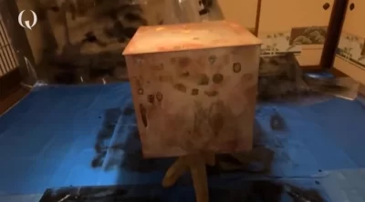 ブルーシートが敷かれた和室に入ると、柱に貼られていたものと同じ子ども向けのシールがベタベタと貼られた箱が置いてあり、見ただけで「絶対に関わってはいけない」と感じさせる強烈なオーラを放っています。