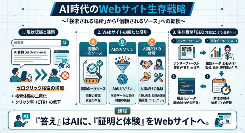 この3つを意識したコンテンツは、「AIに学習素材を提供しつつ、AIには代替されない価値を持つ」という理想的なポジションを取ることができます。