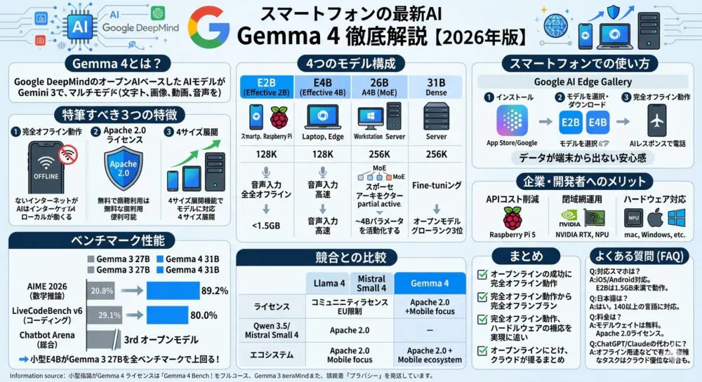 この記事では、Gemma 4の概要・4つのモデル構成・スマートフォンでの運用方法・競合との違いまでを体系的にまとめます。