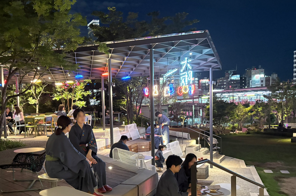 「OMO7大阪」には上の写真のように大きな芝生広場「みやぐりん」があって、そこで夜「PIKAPIKA NIGHT」が開催されます。